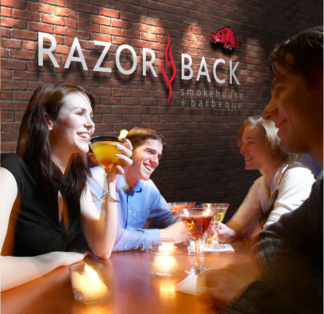 Razorback Smokehouse + Barbeque, is an upscale bistro style restaurant that uses traditional cooking techniques to make deliciously smoked southern food. Using a friendly illustration of a Razorback wild boar as well as incorporating a stylized flame, we built an identity that emphasizes the BBQ offering and fun atmosphere. Coupled with a clean, modern font, the identity coveys an appealing message to any truly refined foodie.
